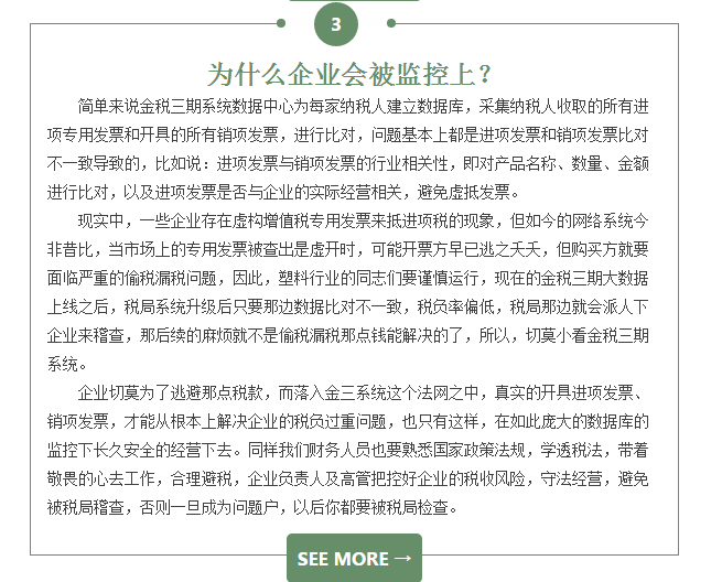 塑料行業(yè)的大家,“金稅三期”上線,偷稅漏稅一旦被盯上,不但可以罰到你破產(chǎn),而且會(huì)直接影響你和子女的終生,企業(yè)的財(cái)務(wù)主管人員也會(huì)被列入黑名單,直接影響未來(lái)的工作。那么點(diǎn)事兒,大家可要謹(jǐn)慎為之。
