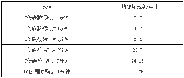 2.軋片的時間決定塑化度的高低,從上述試驗(yàn)得出,5分鐘以后塑化度基本不變,所以制品的落錘沖擊性能基本不變,軋片4分鐘制品的落錘沖擊性能最好,添加碳酸鈣5份的效果跟不添加碳酸鈣塑化4分鐘的效果相當(dāng),10分碳酸鈣的效果跟0份碳酸鈣塑化5分鐘相當(dāng)。