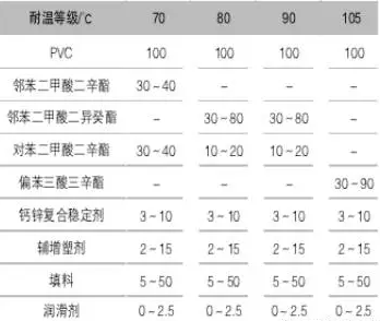 蘇朝北[3]~ [4]等經(jīng)過一系列研究,用國產(chǎn)鈣/鋅穩(wěn)定劑,配合適當溫度等級的增塑劑,分別制得了70,90,105℃的環(huán)保PVC護套料,環(huán)保要求符合RoHS規(guī)定,性能可滿足GB/T 8815-2002的要求。