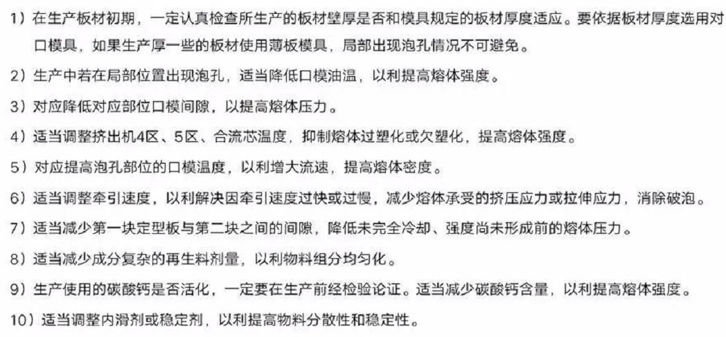 發(fā)泡板材表面出現(xiàn)泡孔,是熔體局部密度過(guò)低的表征。一般出現(xiàn)的泡孔有條孔和圓孔兩種表征,影響因素中有樹(shù)脂、發(fā)泡劑、調(diào)節(jié)劑、碳酸鈣、穩(wěn)定劑等原料因素,也和模具及工藝有關(guān)。