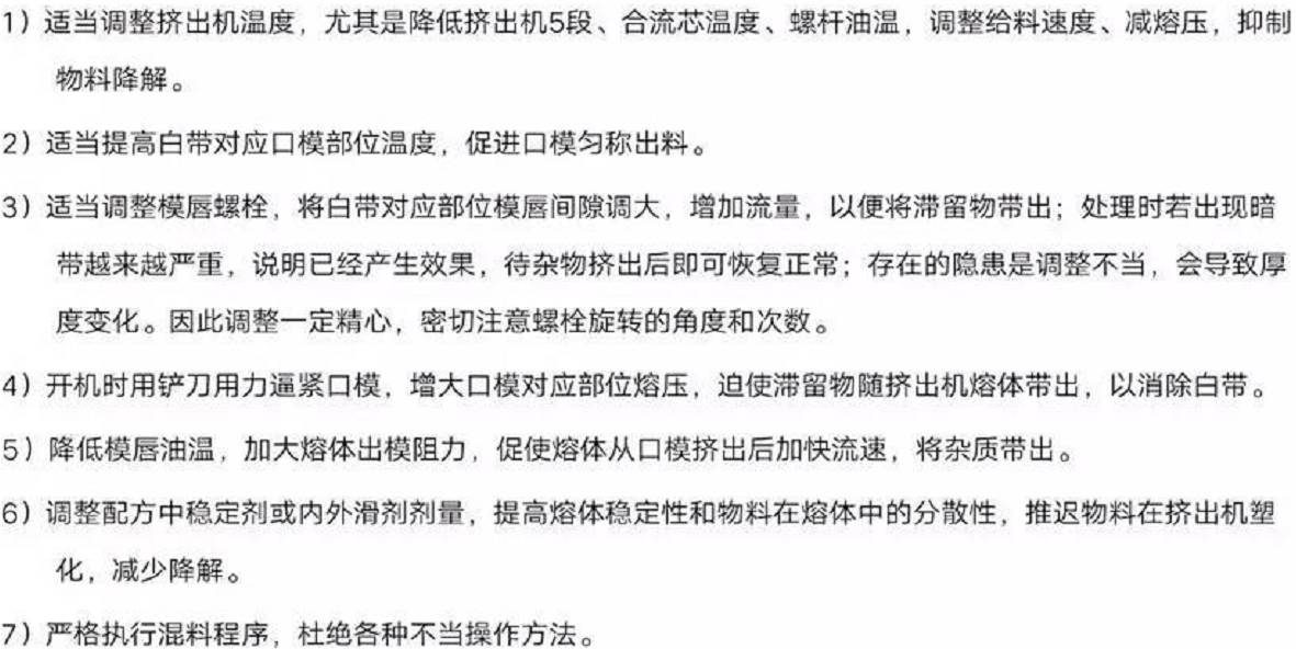 大量實(shí)踐驗(yàn)證,處理白帶有一定時(shí)效性,若處理不及時(shí)或由白帶演變未灰?guī)?,就?huì)失去處理良機(jī)。處理時(shí)應(yīng)對(duì)擠出機(jī)螺桿磨損和裝置情況及近期工藝設(shè)置變動(dòng)情況了如指掌,以便有的放矢應(yīng)對(duì)處理。