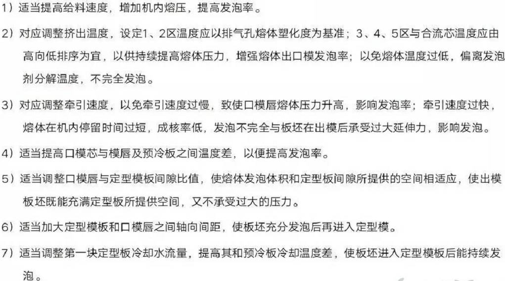 調(diào)整時(shí)應(yīng)根據(jù)生產(chǎn)所需板材質(zhì)量要求,按照程序由簡(jiǎn)到繁,由工藝到配方,由減量到加量進(jìn)行逐項(xiàng)對(duì)應(yīng)調(diào)整。值得注意的是:調(diào)整提高發(fā)泡率,降低板材密度時(shí)應(yīng)按生產(chǎn)發(fā)泡板的需要各有側(cè)重。以上許多調(diào)整措施,譬如調(diào)整措施4)5)7)8)等都是以犧牲結(jié)皮硬度和光亮度等情況,不可過(guò)之而不及,僅僅為降低密度而不考慮結(jié)皮硬度和光亮度。