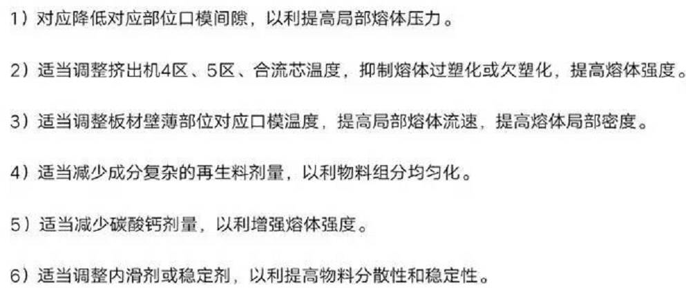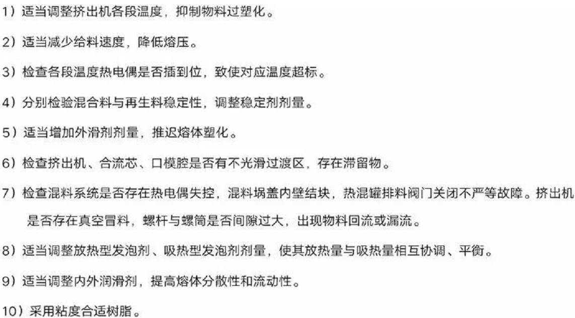 若發(fā)泡制品表面出現(xiàn)大面積泡孔,可適當(dāng)調(diào)整發(fā)泡調(diào)節(jié)劑處理;如在發(fā)泡板表面偶爾出現(xiàn)個(gè)別泡孔,很可能和混料未按混料程序、溫度、加料程序辦事,致使混料不均有關(guān),應(yīng)換料處理;如連續(xù)出現(xiàn)圓形泡孔,應(yīng)適當(dāng)調(diào)整黃白發(fā)泡劑劑量;如發(fā)泡板表面時(shí)而出現(xiàn)長(zhǎng)條泡孔,屬于板面局部密度低的表征,原因比較復(fù)雜,應(yīng)依據(jù)發(fā)生泡孔的時(shí)間、部位和概率,從工藝上采取措施處理: