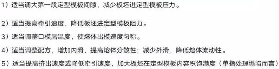 1)口模和白帶對(duì)應(yīng)截面間隙設(shè)置偏小,導(dǎo)致流量偏小,熔體從口模擠出時(shí)厚度稍微減薄,經(jīng)過(guò)定型板時(shí)未和定型板接觸摩擦出現(xiàn)的白帶。