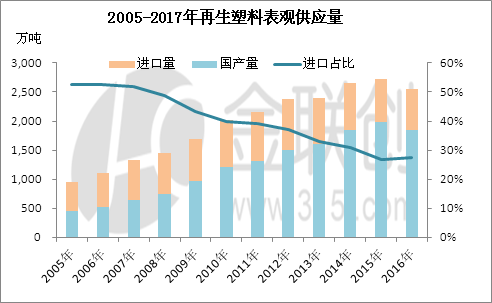 再生塑料進(jìn)口基數(shù)較大,后期禁止進(jìn)口后整體供應(yīng)量損失嚴(yán)重。盡管在2013年海關(guān)綠籬行動(dòng)后,進(jìn)口政策收緊,后期進(jìn)口量增速放緩,但在整體表觀供應(yīng)量中,進(jìn)口料的占比仍高達(dá)30%左右。數(shù)據(jù)顯示, 2016年再生塑料的表觀供應(yīng)量在2546.17萬(wàn)噸,進(jìn)口量就高達(dá)696.17萬(wàn)噸,占比在27.34%。