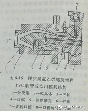 從增強軟質PVC管的成型模具結構圖中可以看出,這種復合模具結構和普通硬質PVC 管成型用模具結構基本相同,不同之處只是多了一段旋轉的口模。擠出的軟質PVC管用熔料,在復合模具中成型管坯時,由另一臺成型硬質PVC螺旋條的擠出機擠出硬質PVC熔料條,從轉動的口模側進入軟質PVC管坯內,由于口模的旋轉,使硬質PVC條纏繞在軟質PVC管坯圓周上,同時隨向前移動的管坯移動,由于有較大流量的軟質PVC熔料受成型模具內壓力作用,則在向前移動時,沒有出口模前軟質PVC熔料把硬質PVC螺旋條完全包容,成型完整的硬質聚氯乙烯螺旋軟質PVC管的管坯,被擠出口模,成型螺旋管