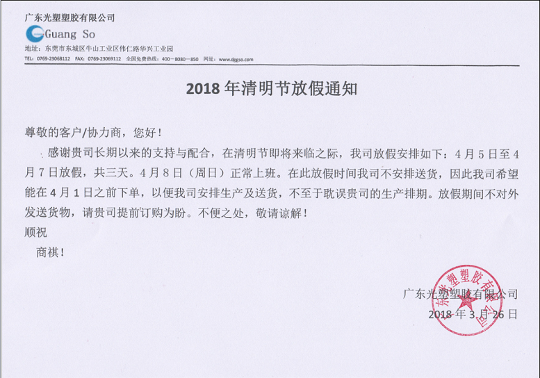 感謝貴司長(zhǎng)期以來(lái)的支持與配合,在清明節(jié)即將來(lái)臨之際,我司放假安排如下:4月5日至4月7日放假,共三天。4月8日(周日)正常上班。在此放假時(shí)間我司不安排送貨,因此我司希望能在4月1日之前下單,以便我司安排生產(chǎn)及送貨,不至于耽誤貴司的生產(chǎn)排期。放假期間不對(duì)外發(fā)送貨物,請(qǐng)貴司提前訂購(gòu)為盼。不便之處,敬請(qǐng)諒解!