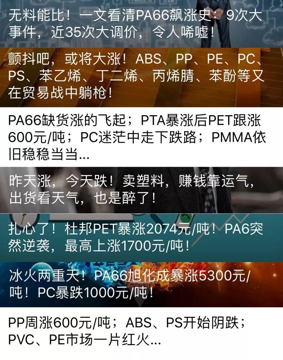 再來看看塑料行業(yè),近期行情也是起伏不定,近兩天才逐漸小幅回調(diào),很多終端企業(yè)飽受漲價之苦!
