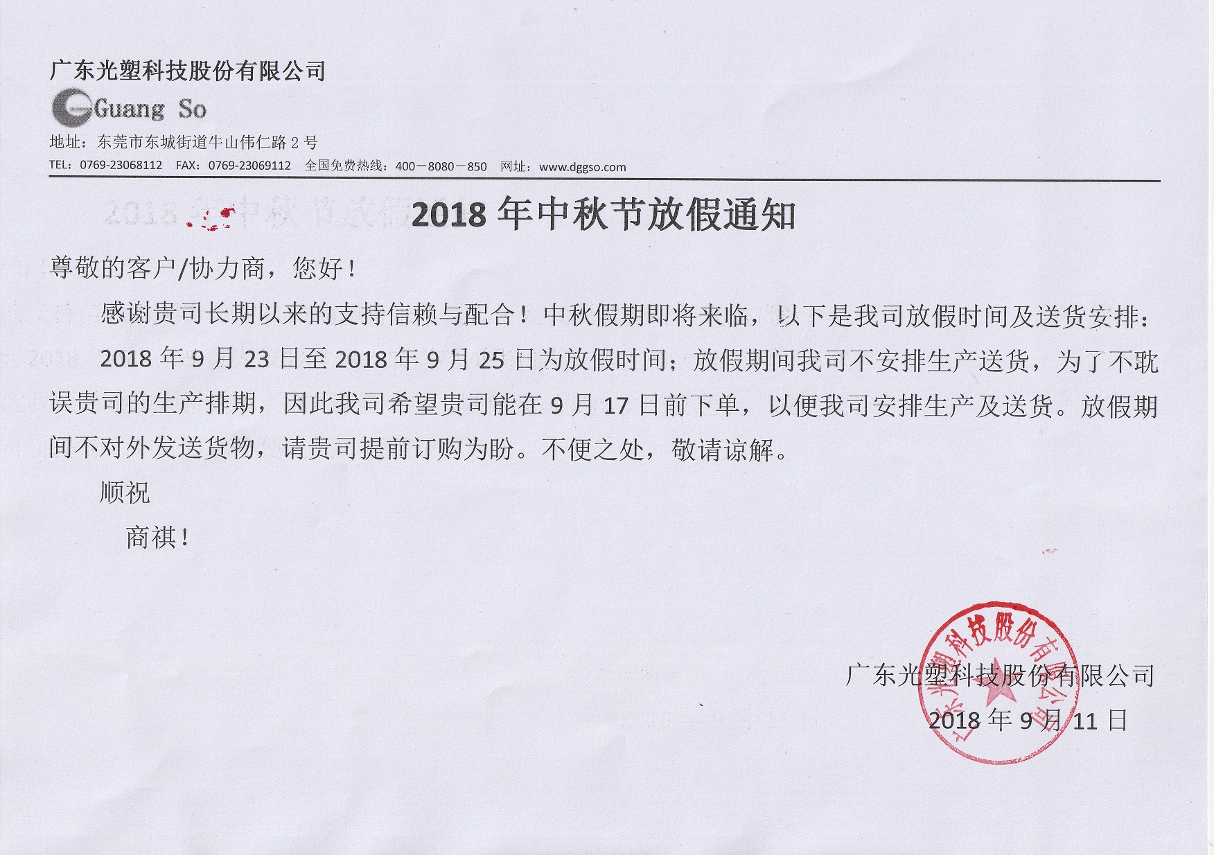2018年9月23日至2018年9月25日為放假時(shí)間;放假期間我司不安排生產(chǎn)送貨,為了不耽誤貴司的生產(chǎn)排期,因此我司希望貴司能在9月17日前下單,以便我司安排生產(chǎn)及送貨。放假期間不對(duì)外發(fā)送貨物,請(qǐng)貴司提前訂購(gòu)為盼。不便之處,敬請(qǐng)諒解。