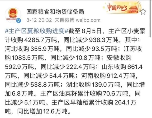 隨著央視抨擊吃播浪費(fèi)的現(xiàn)象以及聯(lián)合國(guó)發(fā)布的饑餓問題后,糧食危機(jī)一時(shí)間飚上各大新聞版塊。8月12日,國(guó)家糧食和物資儲(chǔ)備局發(fā)布今年夏糧的收購(gòu)情況:截止8月5日,主產(chǎn)區(qū)小麥累計(jì)收購(gòu)4285.97萬噸,同比減少938.3萬噸!驟減的數(shù)量,令國(guó)人心中一驚。