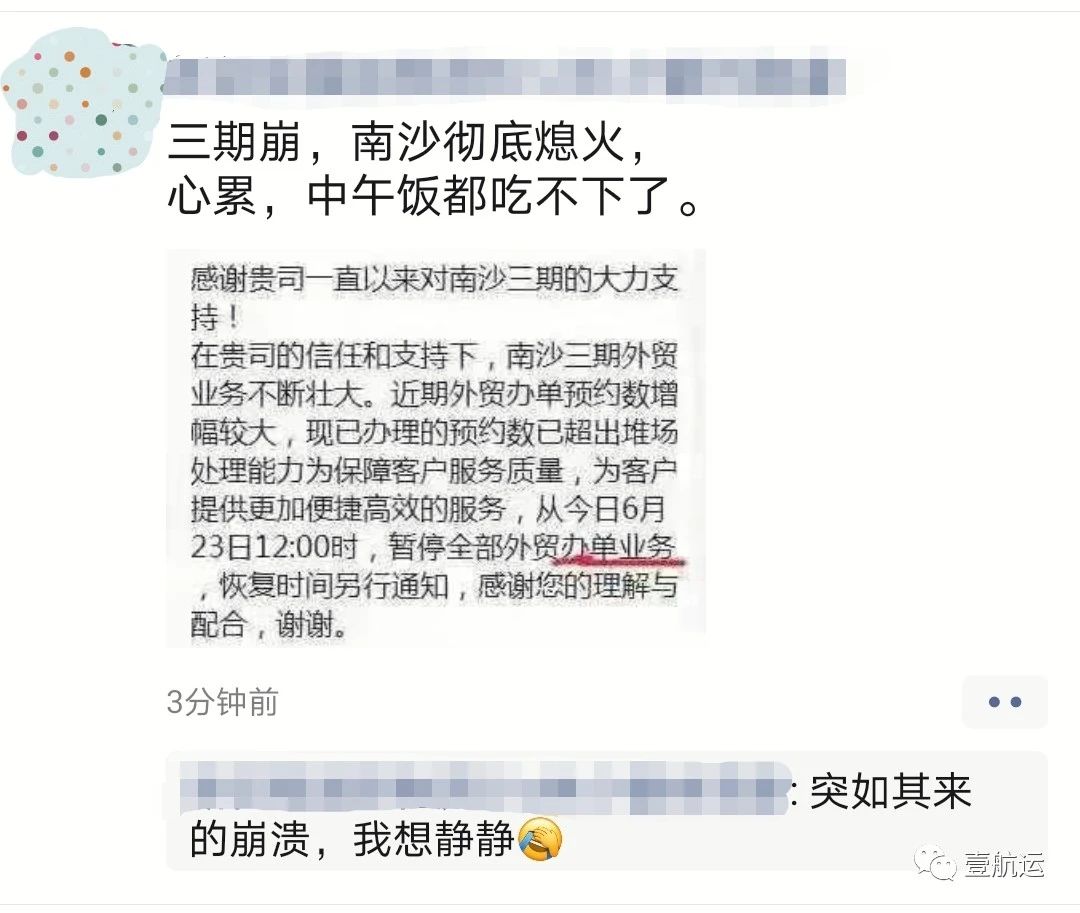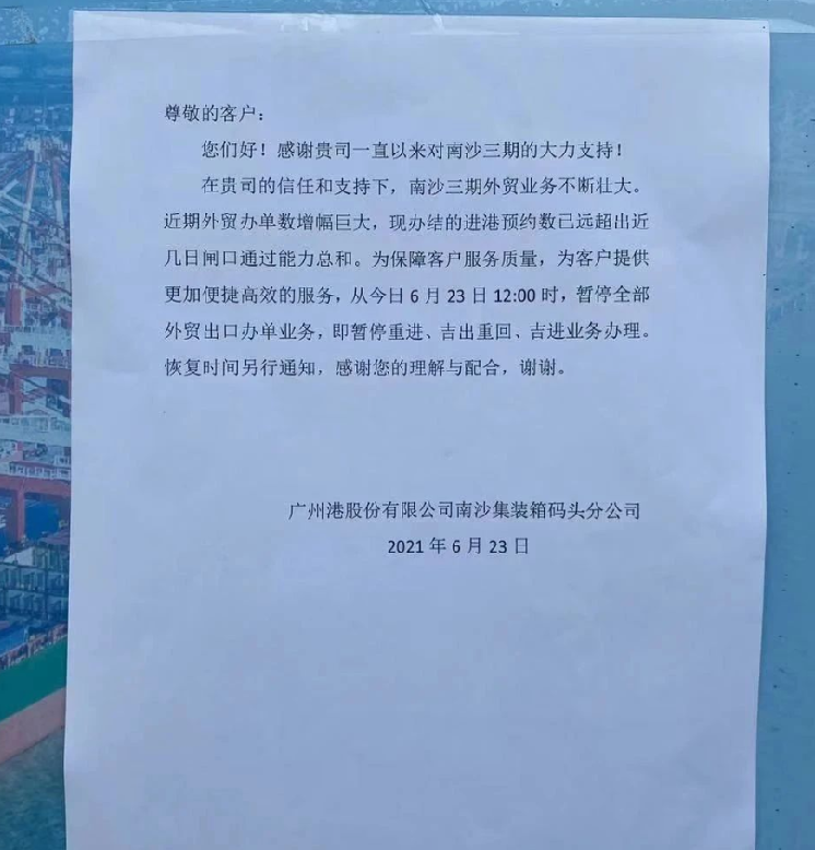 據(jù)壹航運(yùn)獨(dú)家最新獲悉:今天(6月23日)上午,廣州南沙集裝箱碼頭發(fā)布緊急通知: 從今日(6月23日)12:00時(shí)起,暫停全部外貿(mào)出口辦單業(yè)務(wù)